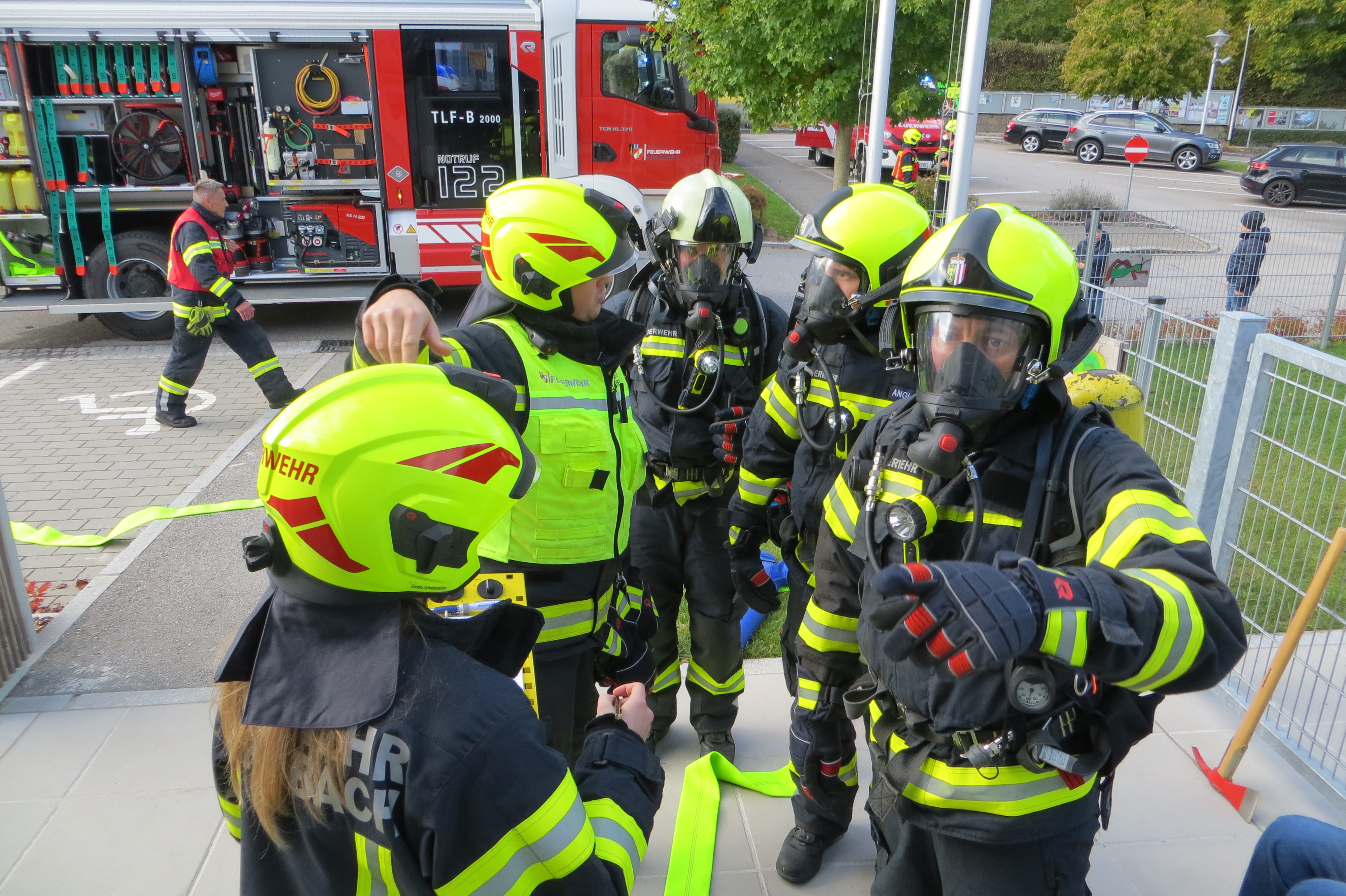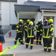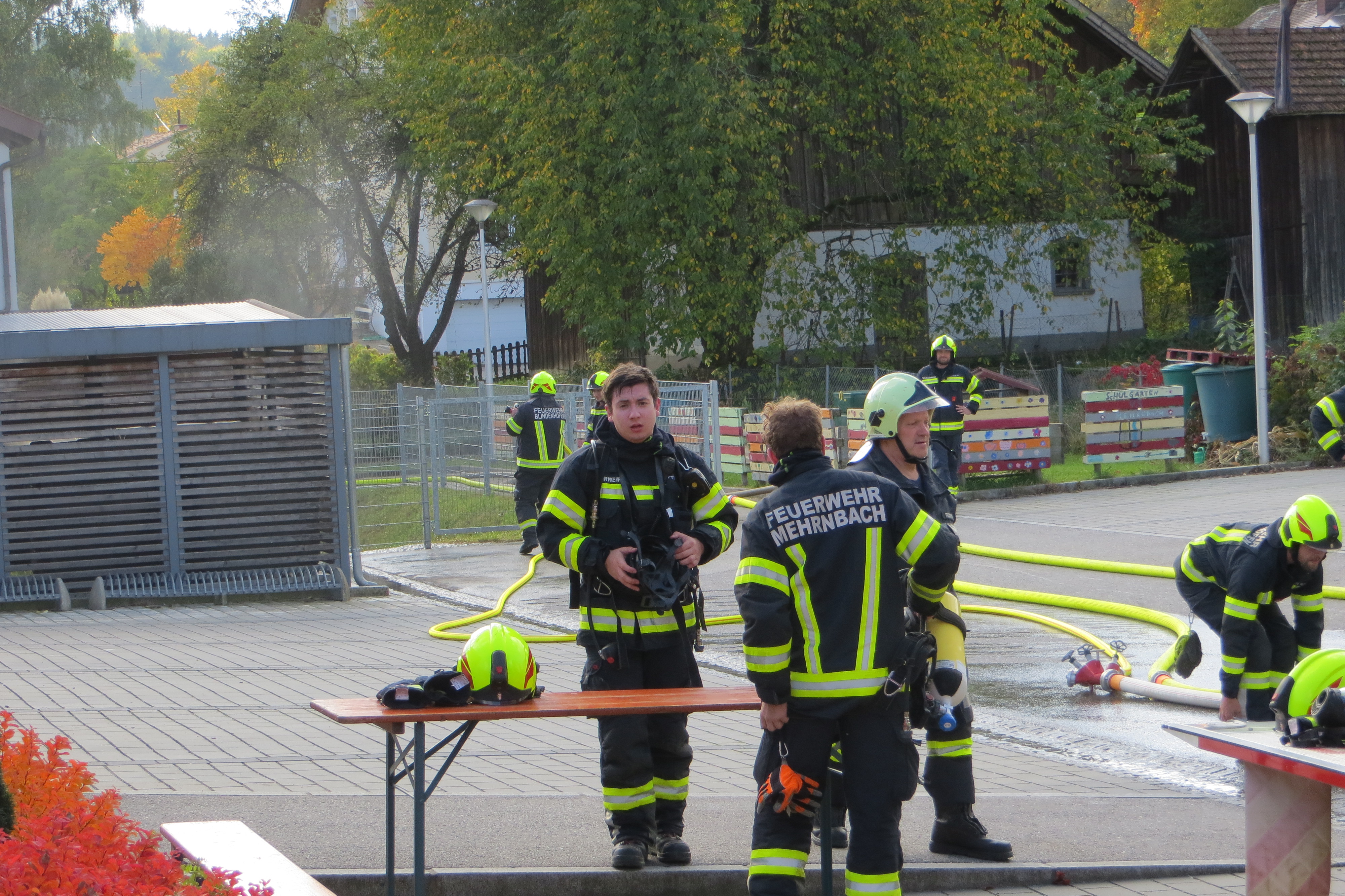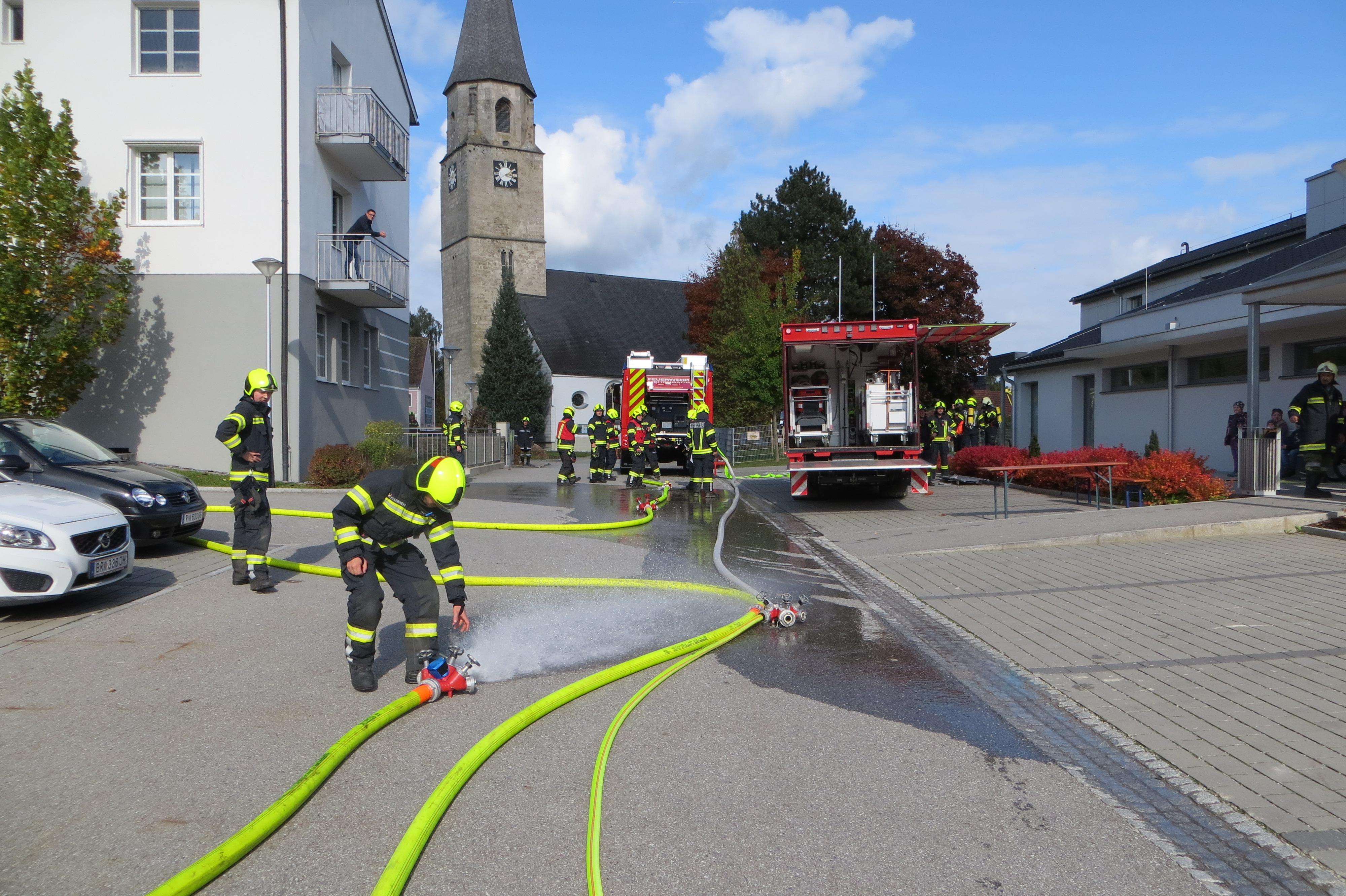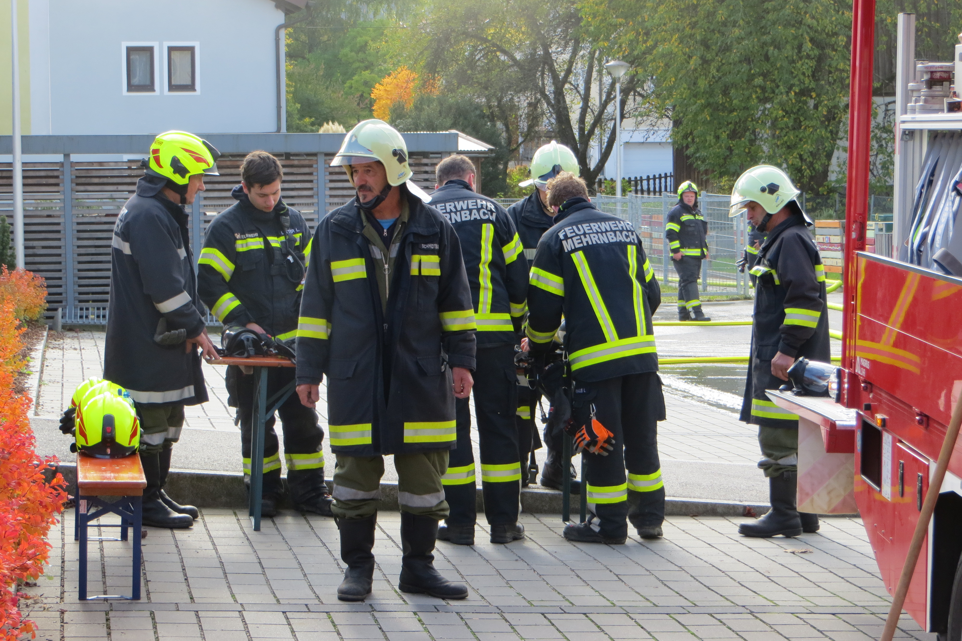 In der Annahme eines Brandes wurde die Zusammenarbeit der Mehrnbacher Feuerwehren geübt. Von der Wasserversorgung aus dem Kretschbach, über die Atemschutztrupps für den Innenangriff bis zur Rettung von Verletzten wurde alles im neuen Gebäude getestet. Auch die Feuerwehr Ried im Innkreis war mit der Drehleiter zu Gast.