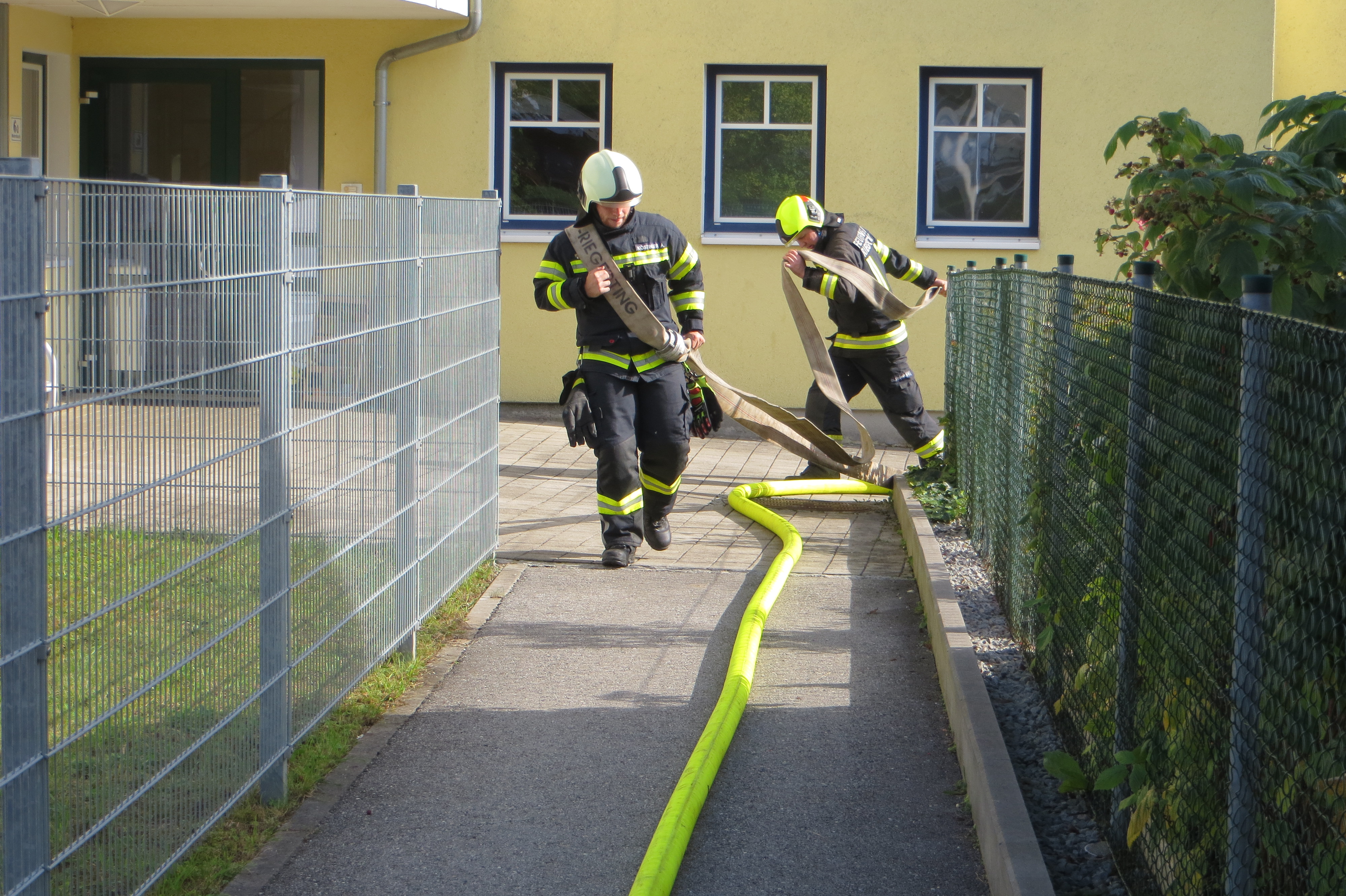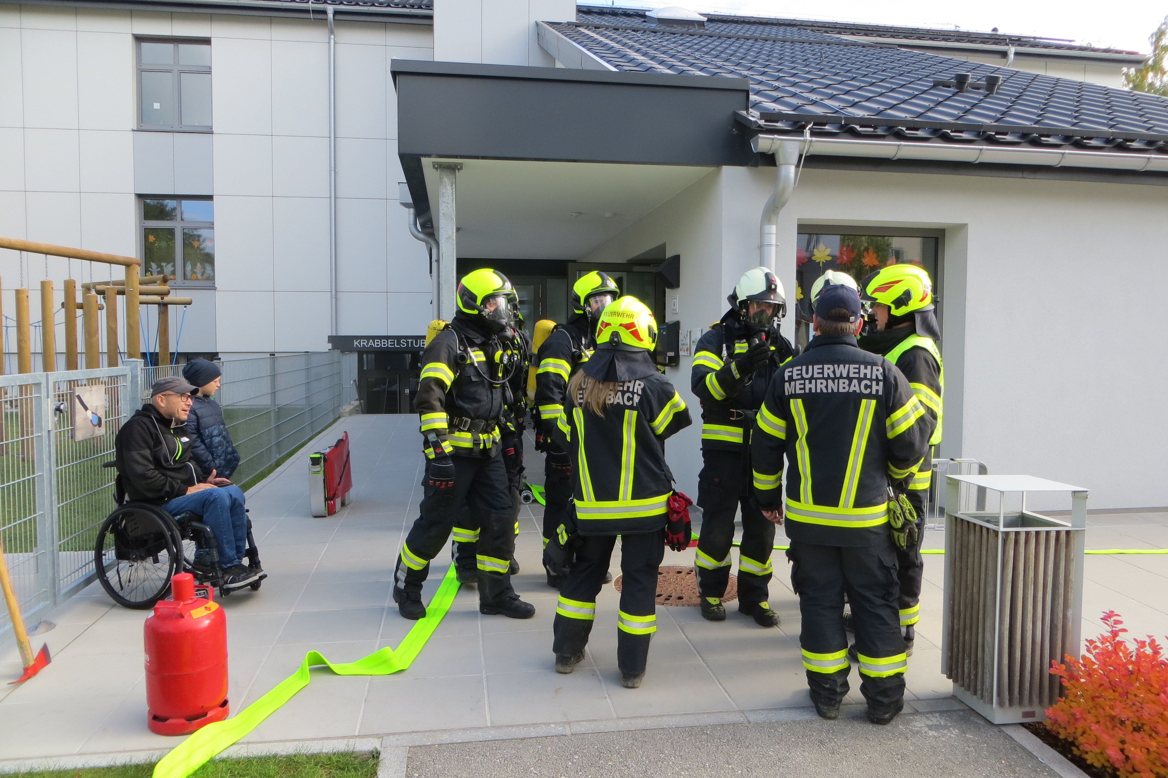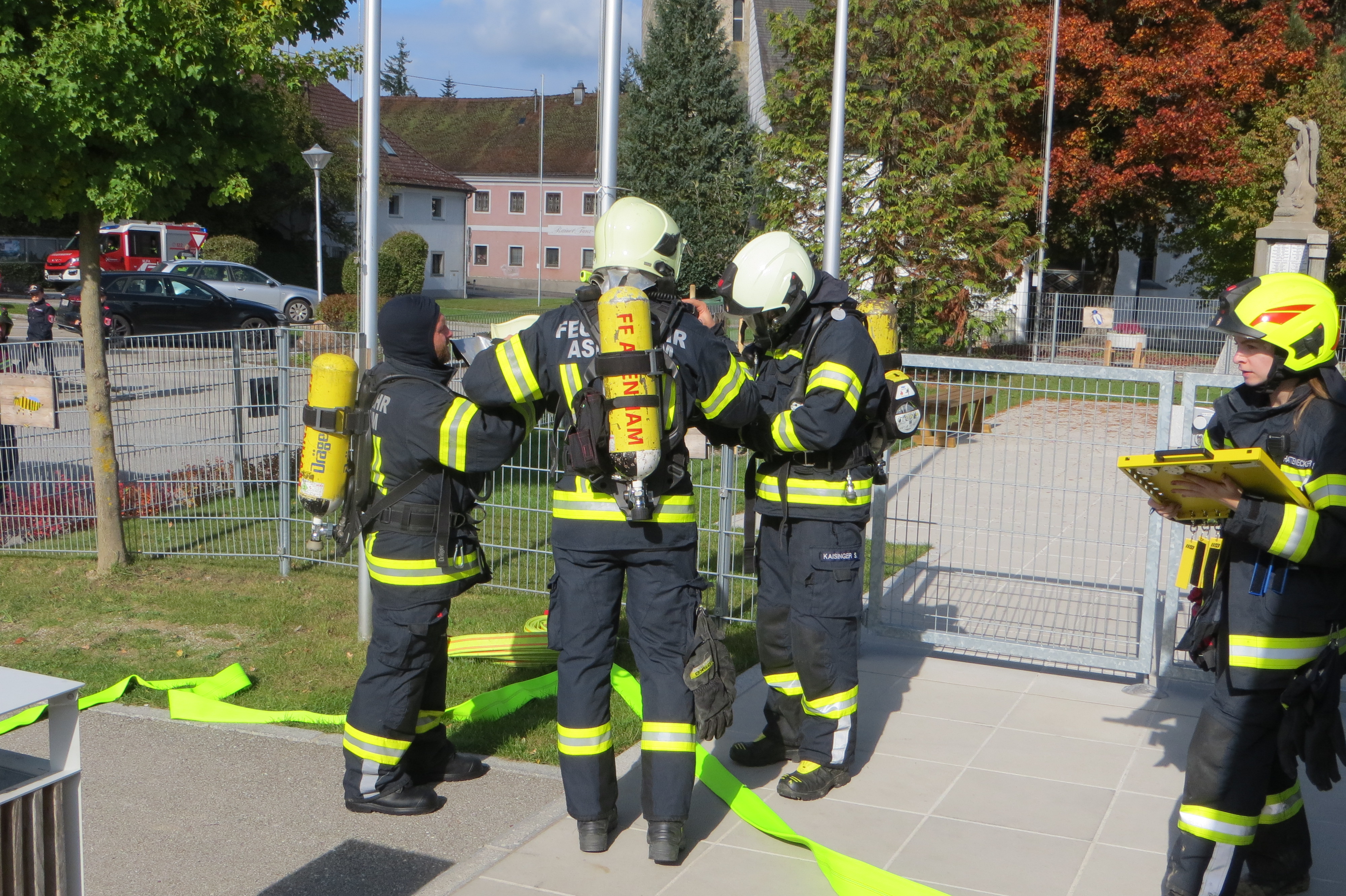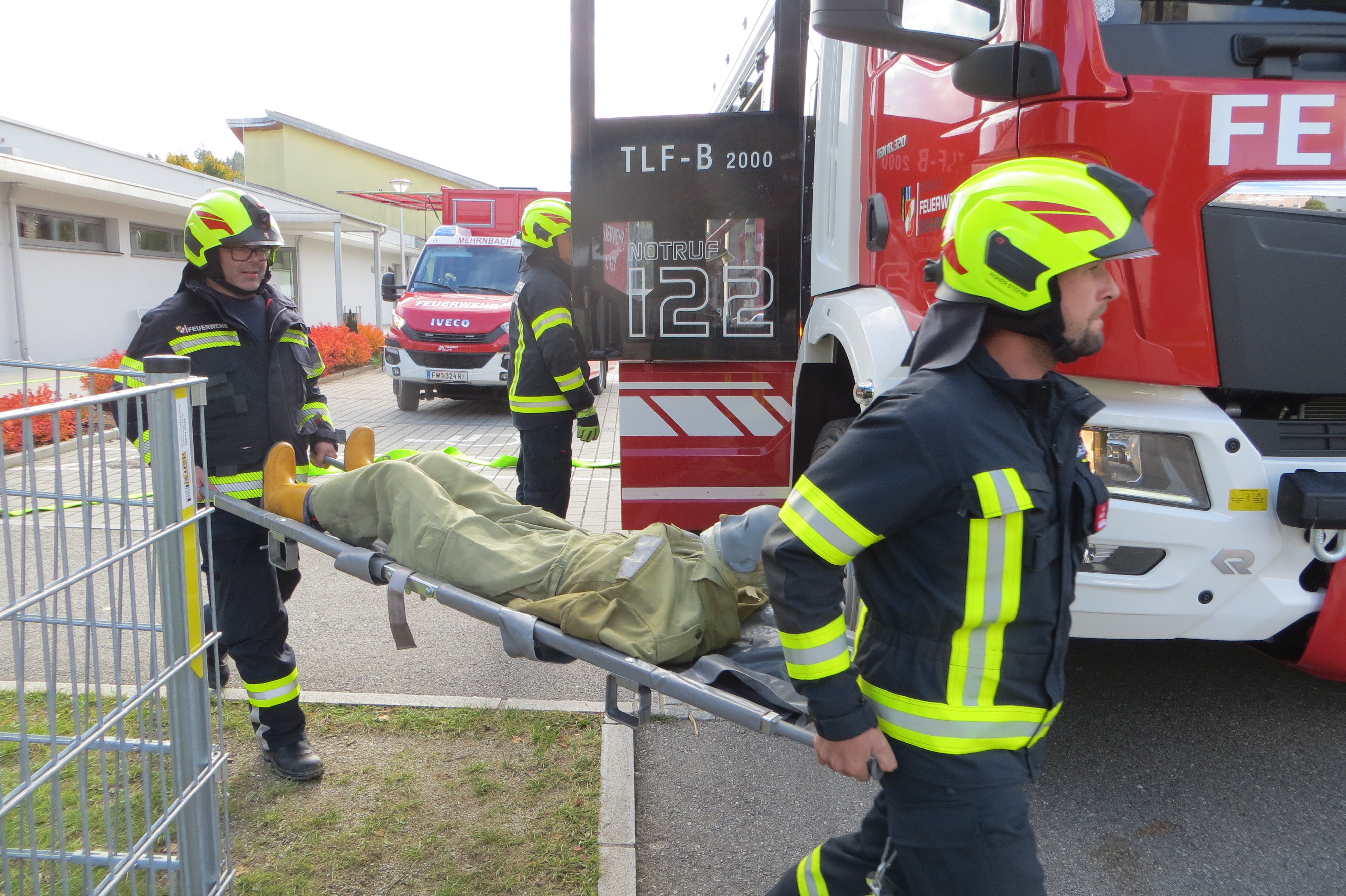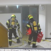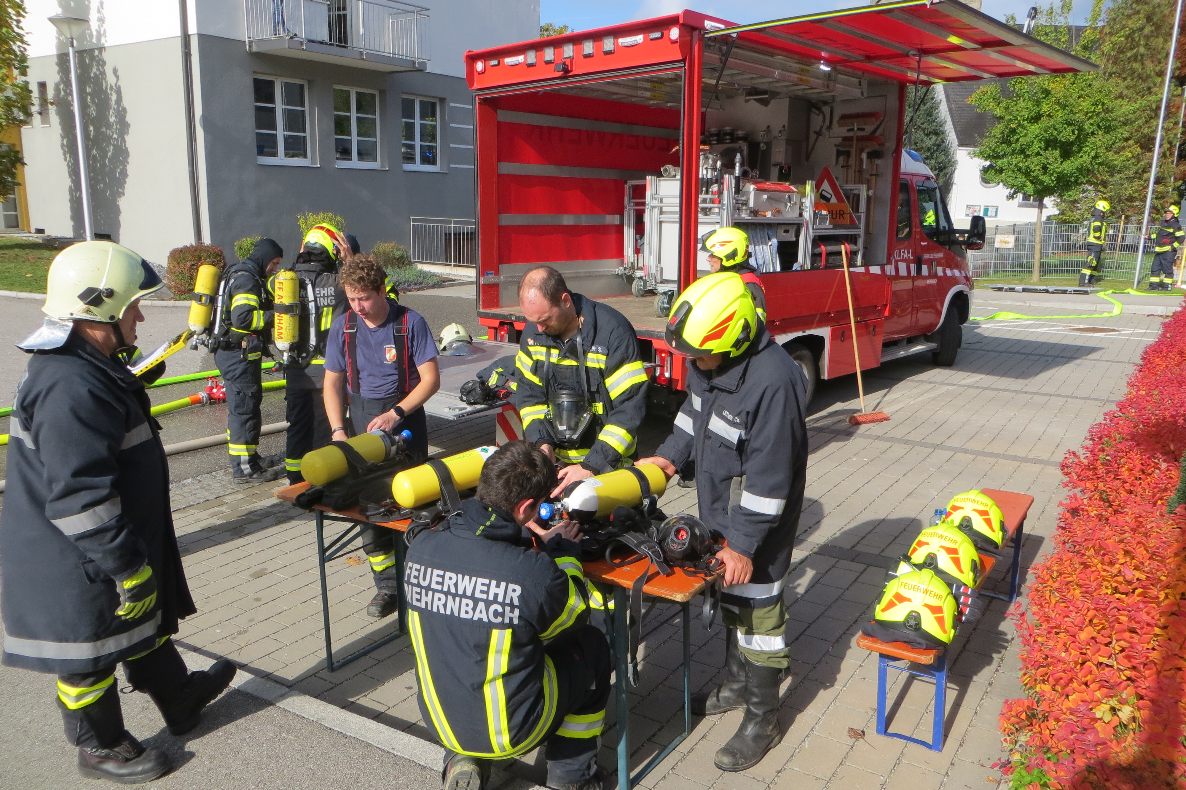 In der Annahme eines Brandes wurde die Zusammenarbeit der Mehrnbacher Feuerwehren geübt. Von der Wasserversorgung aus dem Kretschbach, über die Atemschutztrupps für den Innenangriff bis zur Rettung von Verletzten wurde alles im neuen Gebäude getestet. Auch die Feuerwehr Ried im Innkreis war mit der Drehleiter zu Gast.