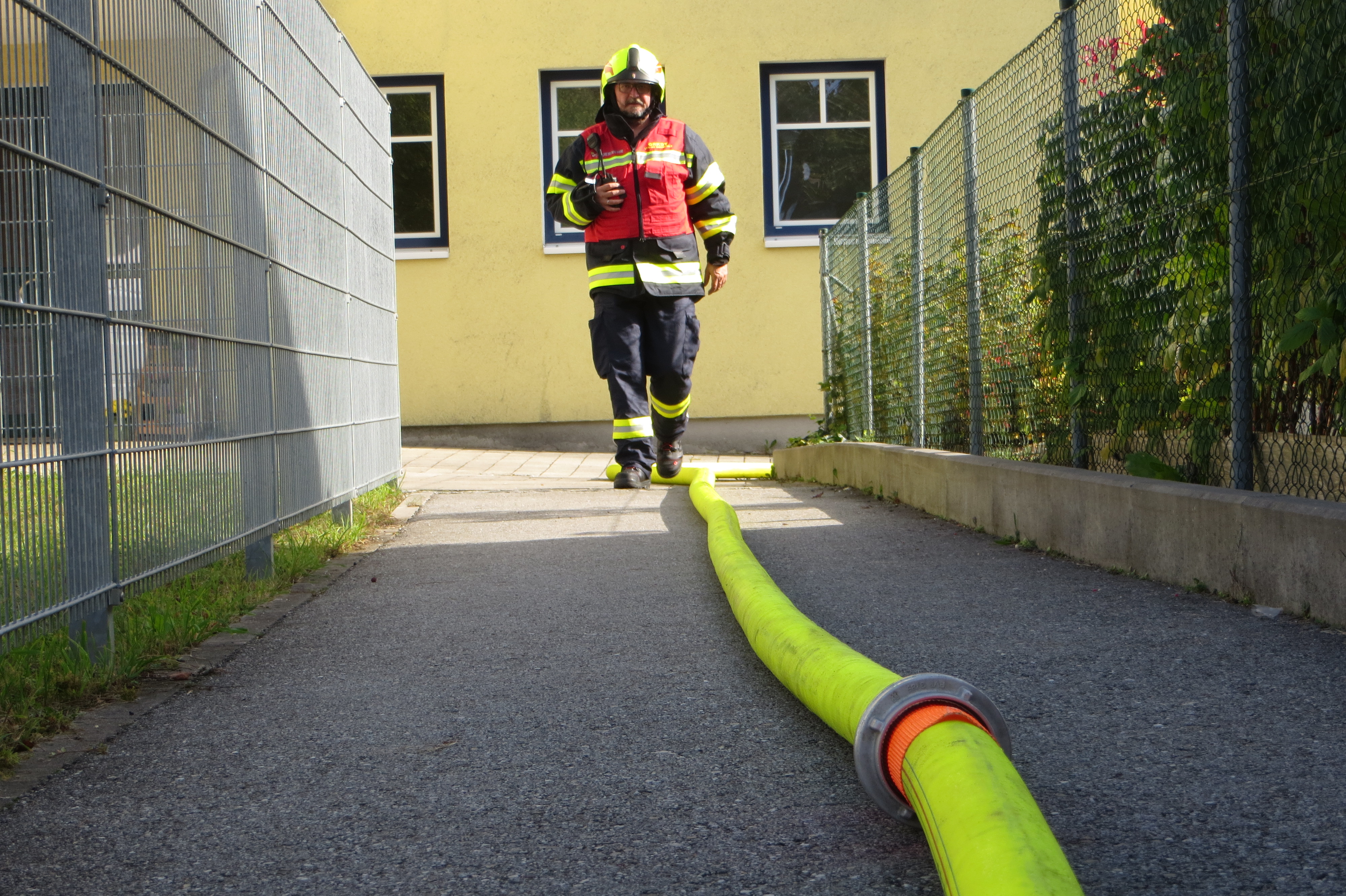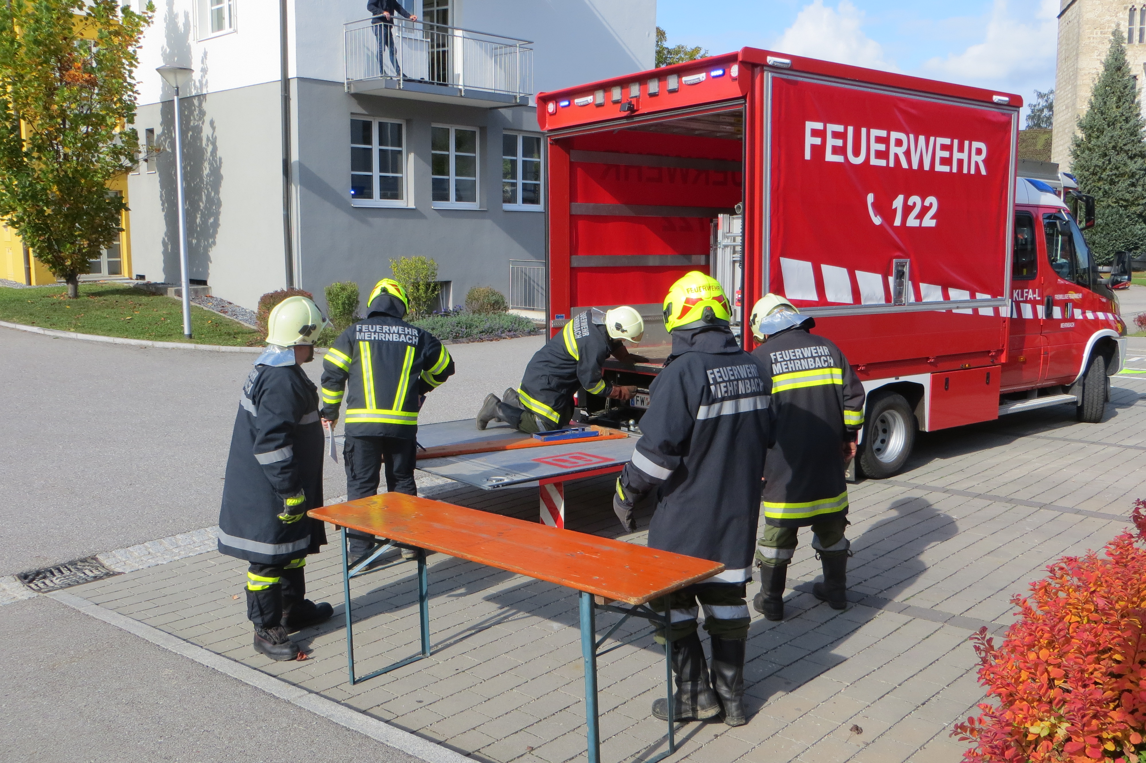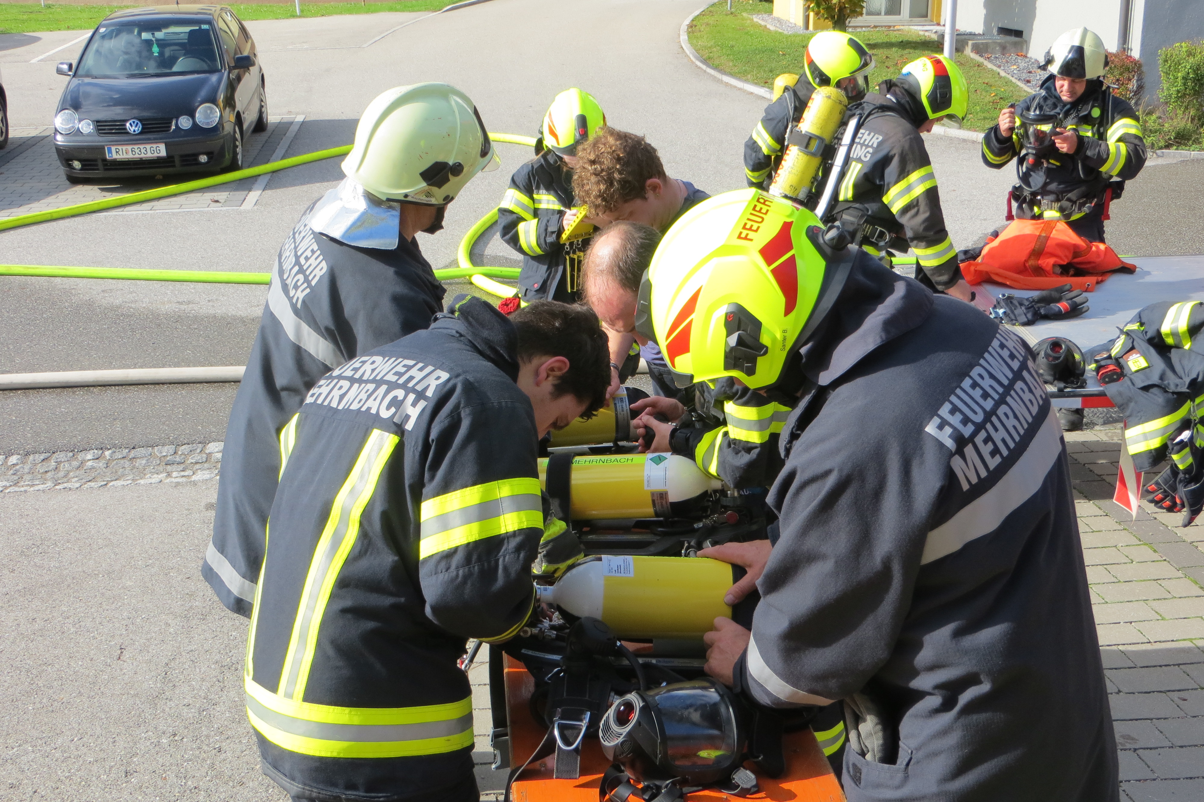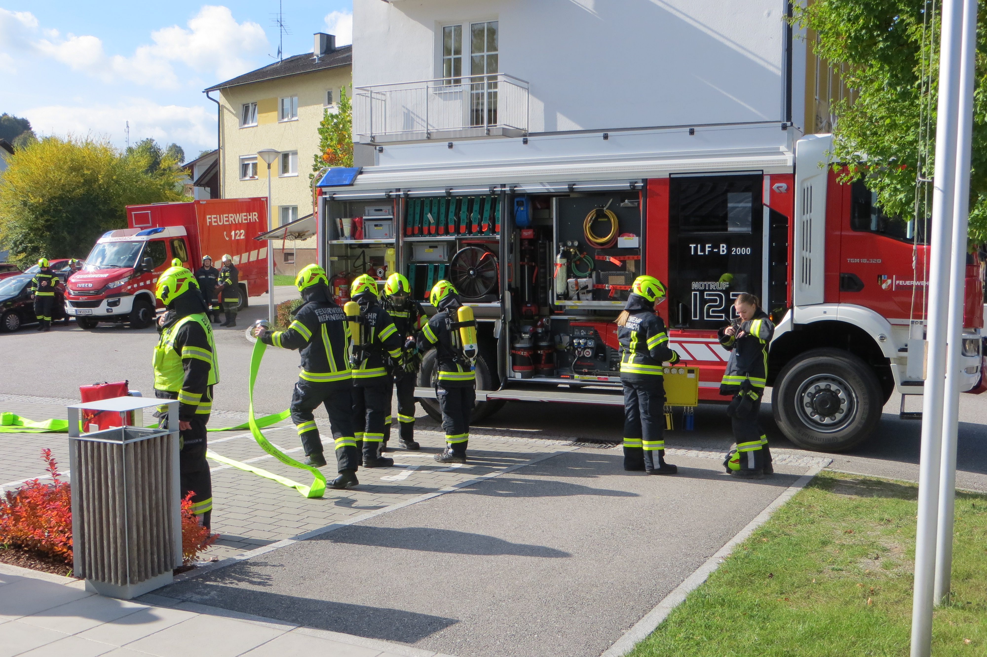 In der Annahme eines Brandes wurde die Zusammenarbeit der Mehrnbacher Feuerwehren geübt. Von der Wasserversorgung aus dem Kretschbach, über die Atemschutztrupps für den Innenangriff bis zur Rettung von Verletzten wurde alles im neuen Gebäude getestet. Auch die Feuerwehr Ried im Innkreis war mit der Drehleiter zu Gast.